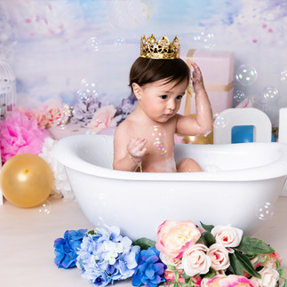 Emely turned 1! Thats a huge milestone. Her lovely grandmother contacted me to set up. this cake smash. Turns out she lives right around the corner from me in Lake Elsinore California. I really love serving my own neighbornood and community. They brought the most beautiful blue outfits for her ( I LOVE little girls in BLUE) and selected the Blue Castle Fairy backdrop, so of course the crown was a must have. The cake was a 4 layer 6" pink ombre confetti cake with buttercream frosting. Every baby is different..some dive into the cake with wild abandon and others are more reserved about it. Emely preferred eating her cake with a spoon and decided to try to knock the cake over with her feet. we finished the session with a bubblebath.